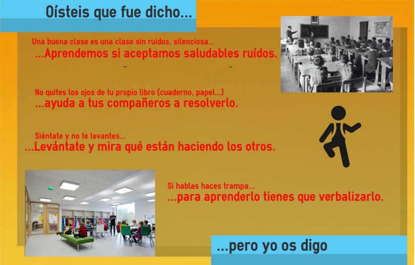 Parafraseando el Sermón de la Montaña donde Jesús trae aire limpio y nuevo, os ofrezco esta sencilla infografía para comenzar el curso. Porque… ¿habéis entrado alguna vez en un lugar de trabajo donde todos trabajen individualmente, en silencio, sin levantarse…? ¿Habéis visto alguna vez un banco o unas oficinas oficiales así? Imposible. Sin embargo, hay quien se empeña que nuestras aulas funcionen de esta manera. Silencio no es aprendizaje. Sólo aprendemos con los otros.