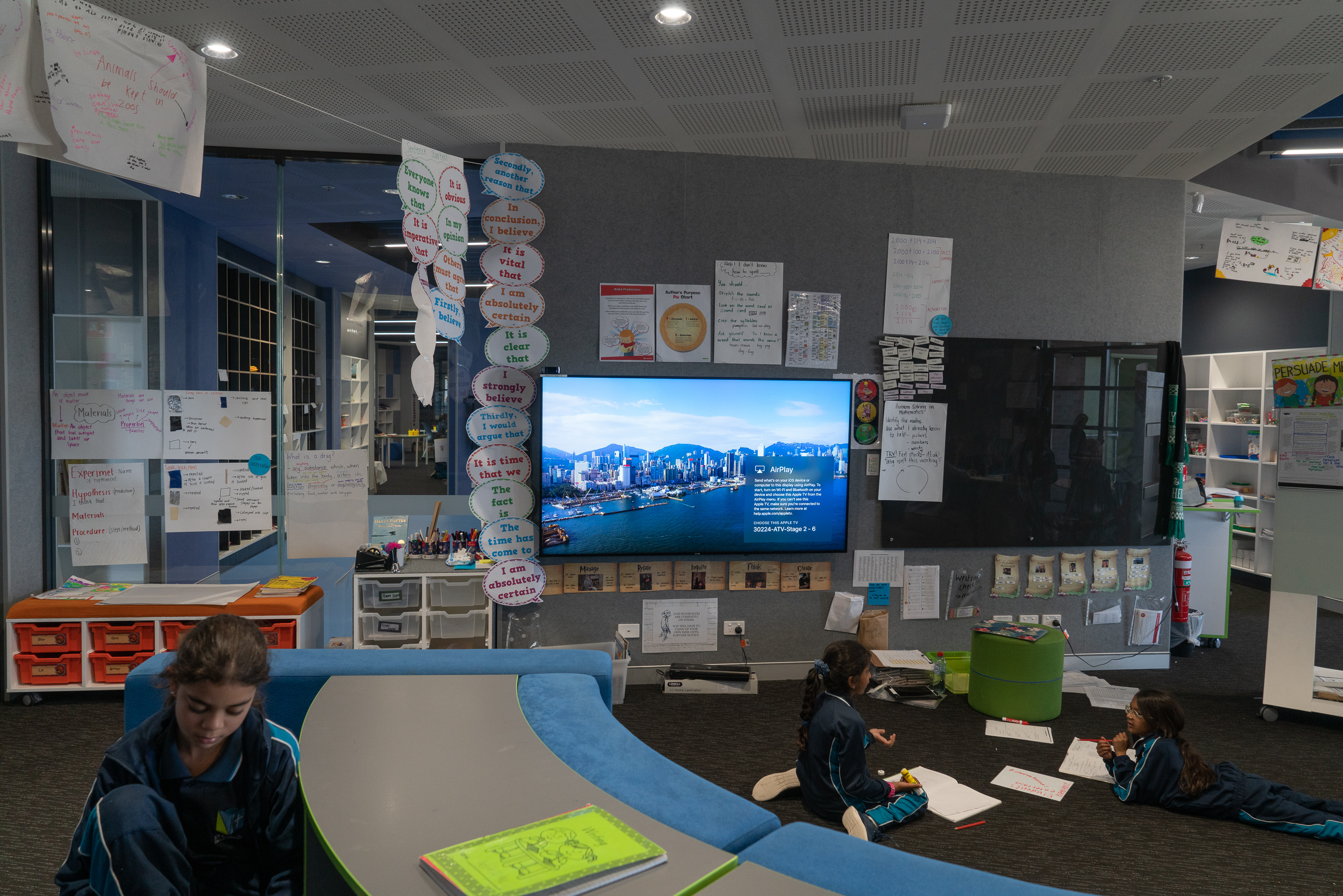 Por supuesto son espacios libres de tarimas y de mesas del profesor. Lo que sí puedes encontrar son innumerables monitores desde donde cada alumno puede conectarse con su dispositivo para trabajar o compartir su trabajo. Los alumnos tienen IPad, Chromebook, ordenadores… Es curioso que estas pantallas están a la altura de los ojos de los alumnos. Cuanto más pequeños son los cursos, a menos alturas desde el suelo se encuentran. Hay también grandes y numerosos espacios con vinilos para escribir. Las paredes tienen cubrimiento textil para poder pegar cosas con velcros. Los techos con corcho y el suelo de moqueta ayuda a amortiguar el ruido. Lo importante es que todos los espacios son flexibles y hay también otros más pequeños para una atención más individualizada.