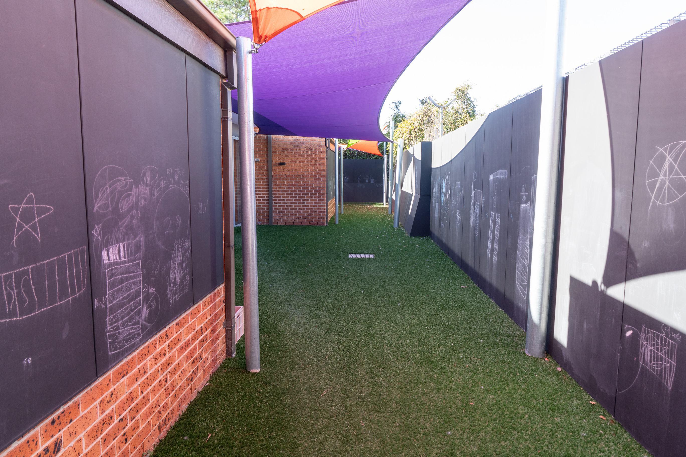 Como los dos colegios anteriores que hemos visitado, todos los espacios son educativos. En el patio hay lonas para poder trabajar protegidos del sol. Hay paredes con pintura especial de pizarra donde los alumnos por grupos trabajan matemática con tizas en el propio patio.
