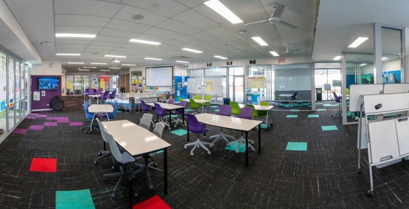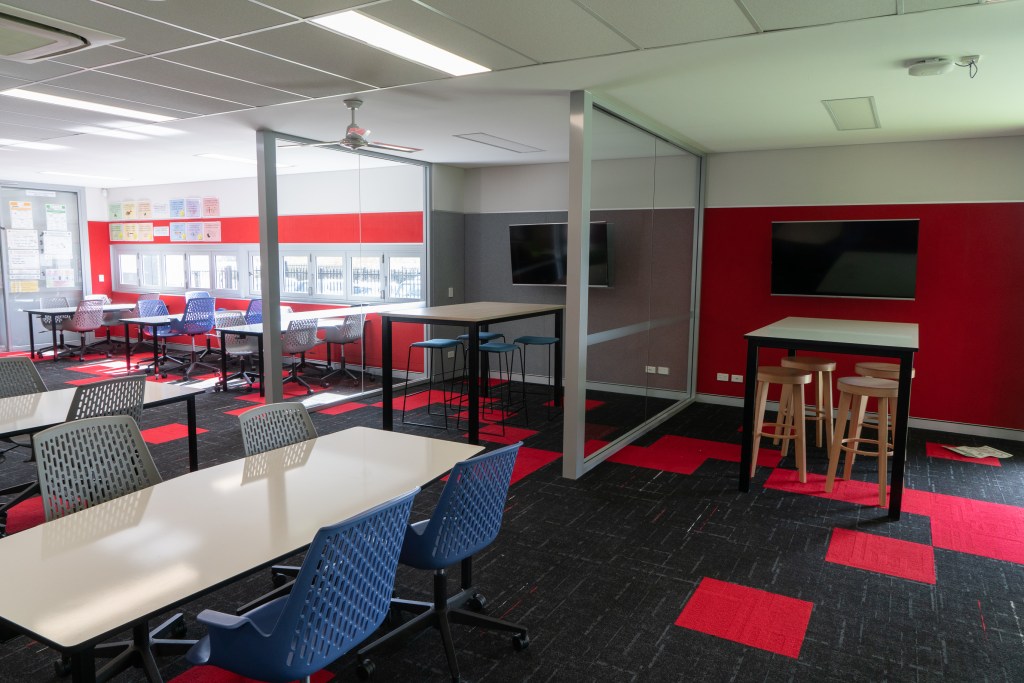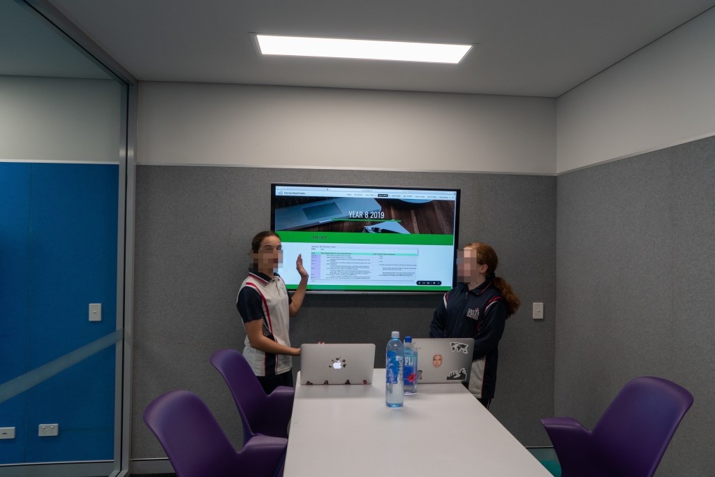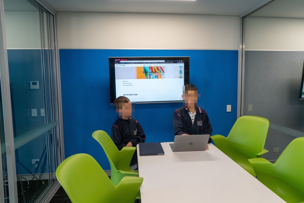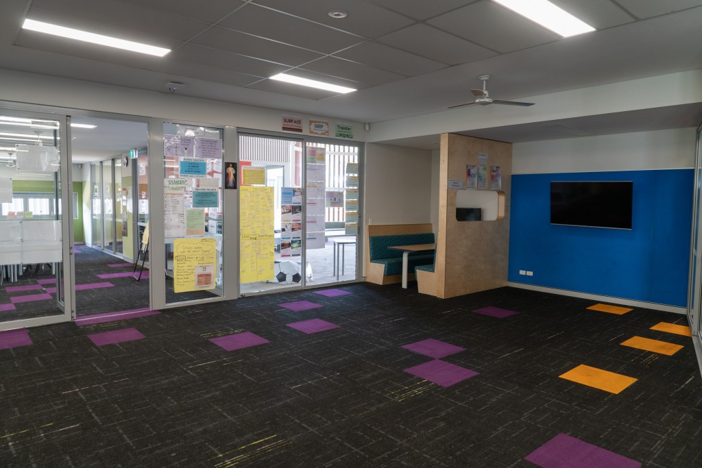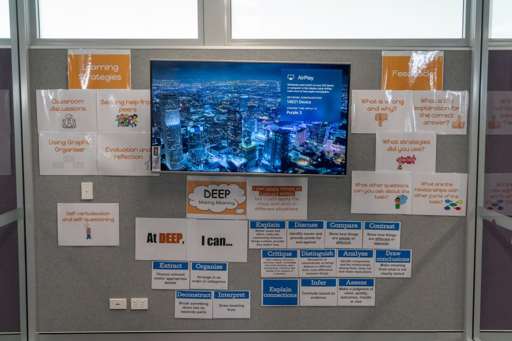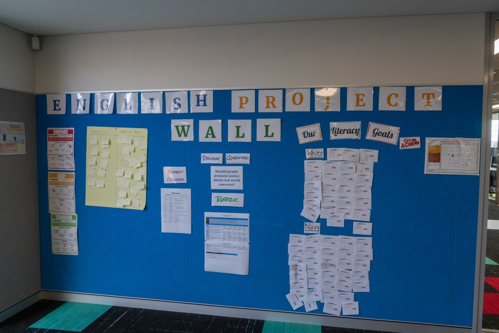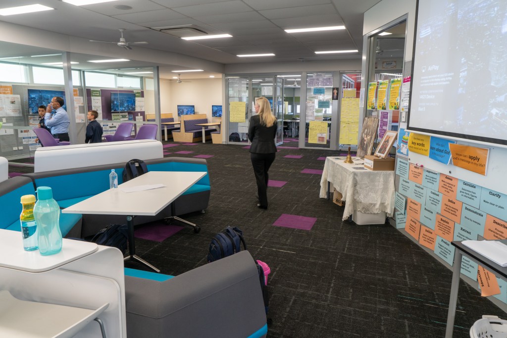 En Santa Sophia, como en los demás centros que hemos visitados, todo es muy visual. Todo está lleno de pantallas y material didáctico, mapas de PBL… en las paredes. Todo el mobiliario está pensado para los alumnos. Espacios para trabajar en grupo, otros para las “masterclass”… se integra mucho la tecnología en las aulas.