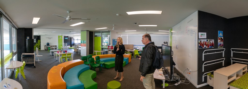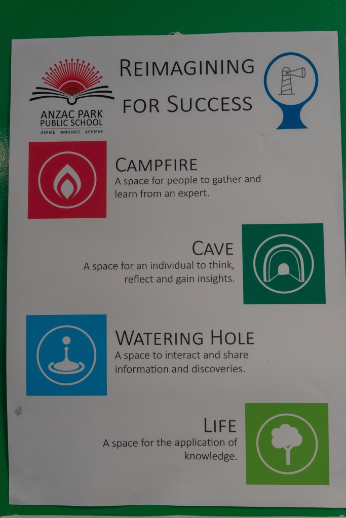 Los espacios de aprendizaje de Anzac Park están diseñados para configurarse de diferentes modos y adaptarse a las necesidades de aprendizaje de los estudiantes. Existen espacios de aprendizaje flexibles que posibilitan el aprendizaje social y cooperativo. Se mezclan espacios dirigidos para el profesor con los dirigidos para los estudiantes. Espacios para el trabajo por proyectos, para la instrucción directa, para la innovación y el pensamiento creativo. Espacios para trabajar destrezas que mejoran las relaciones y para resolver problemas.