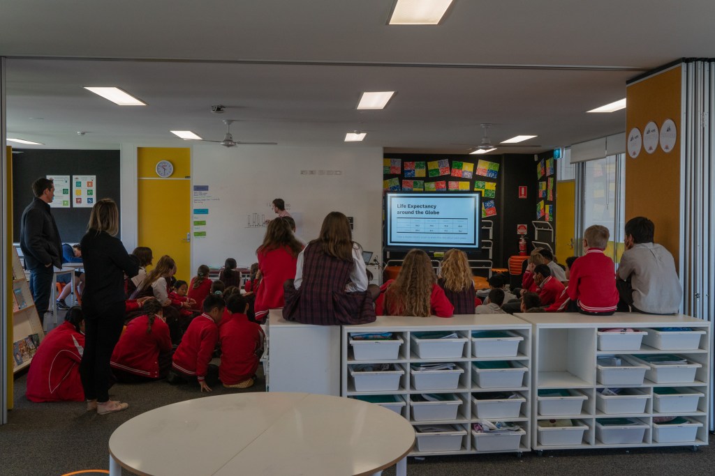 En cada aula (Hiperaula) hay alrededor de 50 alumnos con dos profesores. La ratio de 25 alumnos por profesor es la normal en cualquier escuela pública australiana. Al entrar, no todos los alumnos están haciendo lo mismo. Unos están leyendo, otros están trabajando por grupos. Eso sí, no hay alumnos de diferentes cursos. En cada Hiperaulas, todos tienen la misma edad.