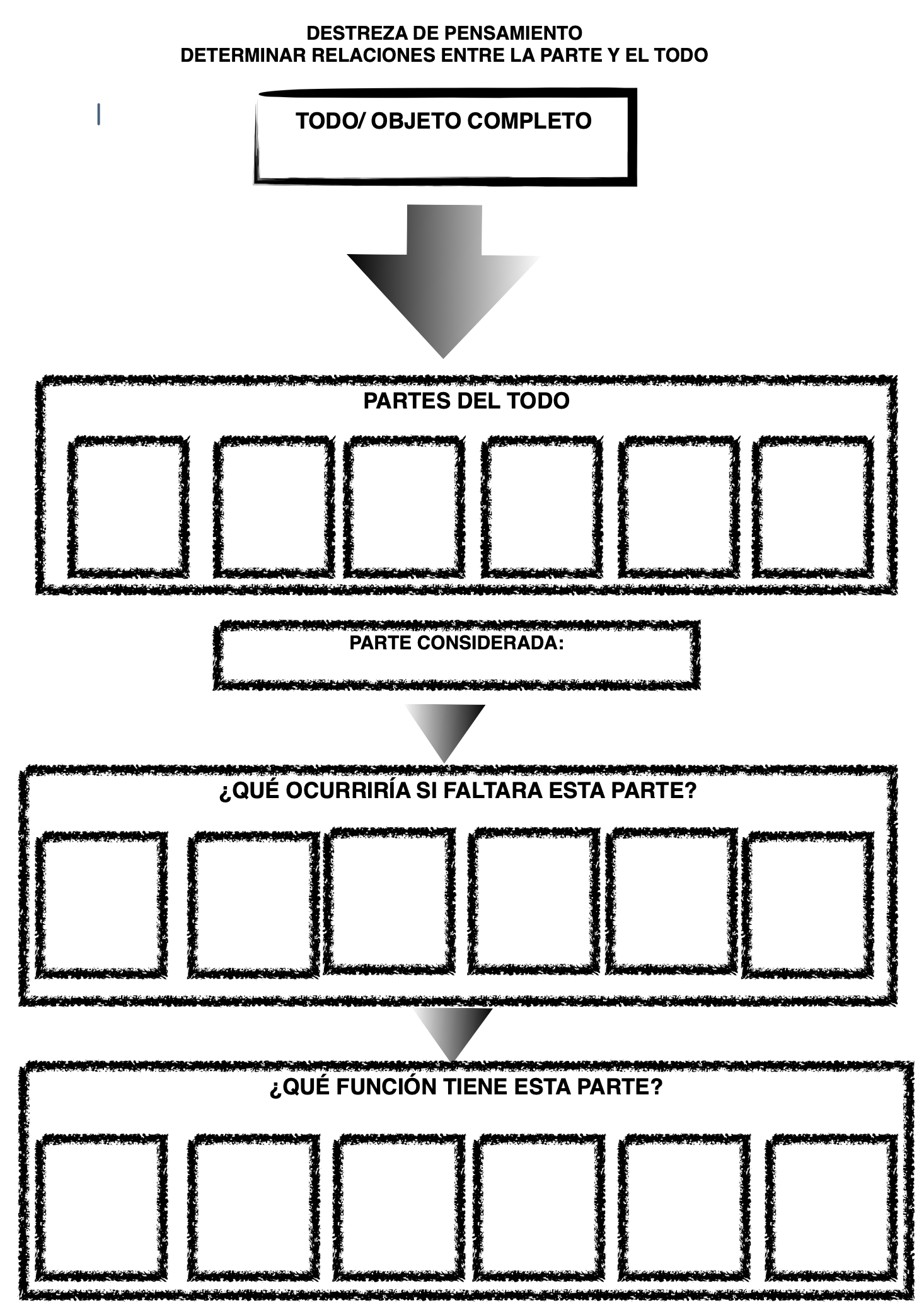 Un mapa de pensamiento es algo que los alumnos revisaran constantemente cuando están empleando una determinada destreza hasta que al final sirva para describir cómo lo está haciendo. En la lección sobre el cernícalo que hemos visto, el docente presenta a sus alumnos esta destreza. Lo hace en un comienzo aplicando en qué consiste analizar con eficacia las partes que forman un todo. ¿Y cómo lo hace? Pues en forma de preguntas dentro de un mapa de pensamiento.